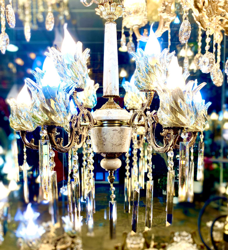 لوستر 6 شاخه 12 شعله برنجی با سنگ طبیعی